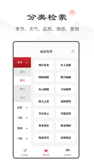 3.详细成语类型检索服务功能,学生能够根据季节、景物、历史典故等挑选找到想要的成语。