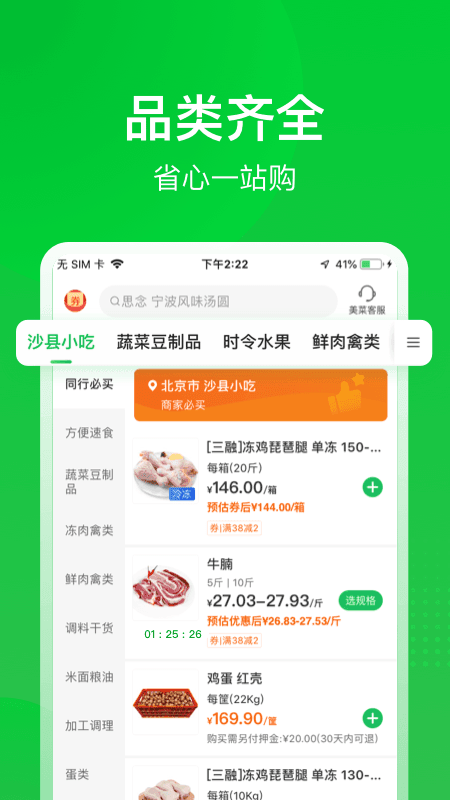 这款软件能够给广大的用户提供最新鲜,最低价,品种更全等等一站式的购物服务,所有的商品都有着详细的分类列表,在采购方面能够提供更加便捷化的操作方式。所有的用户在软件中都可以购买到自己所需的各种鲜肉水产新鲜蔬菜等等商品,每一款商品都能够让你买的称心如意,在购物过程中,用户如果有任何问题,会有专业的客服在线为你解决,让你的购物过程更加的轻松舒适。
