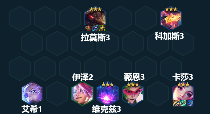 如果劫来得早,可以7人口卡50块钱用利息慢D3星尼菈和2星劫,开6决斗+佐伊即可