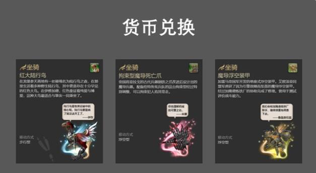 玩家在游戏当中可以使用金币、成就币以及魔金锡币以及各种可以用来兑换坐骑的各种货币类型的道具获取坐骑,不同的价格可以获得的品质是不一样的。