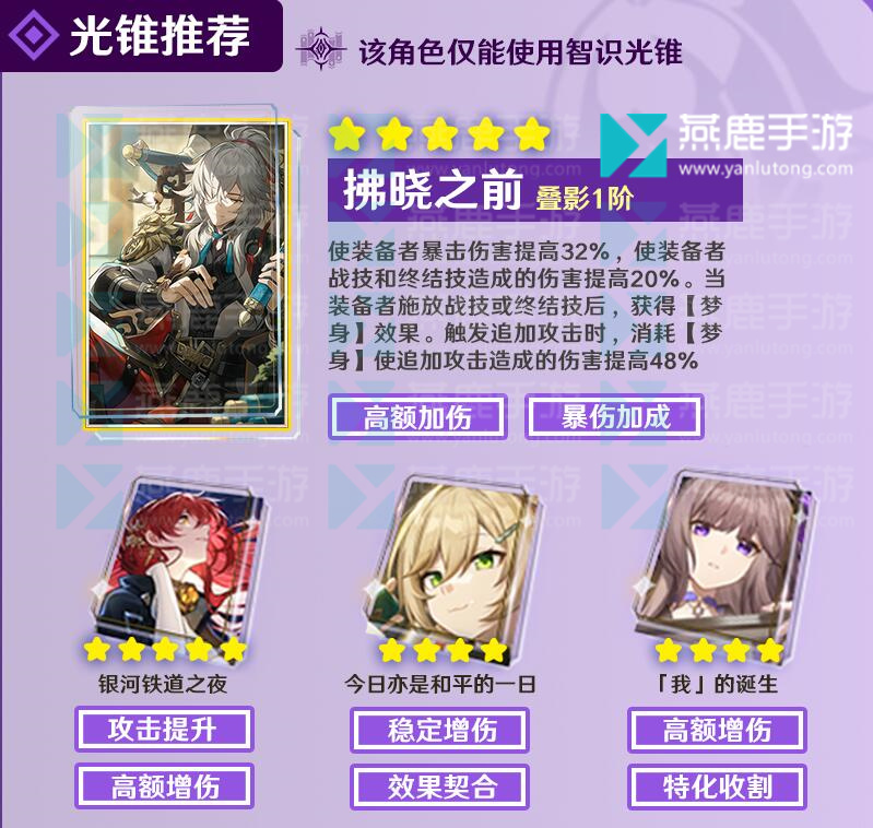 【拂晓之前】:景元的专属光锥。能提高爆伤,也会提高战技和终结技伤害。同时神君的追加攻击伤害也提升了,是景元最适配的光锥。