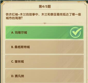 4、铁衣红袖-木兰的故事中,木兰和泰亚最终抵达了哪一座城市的海港?