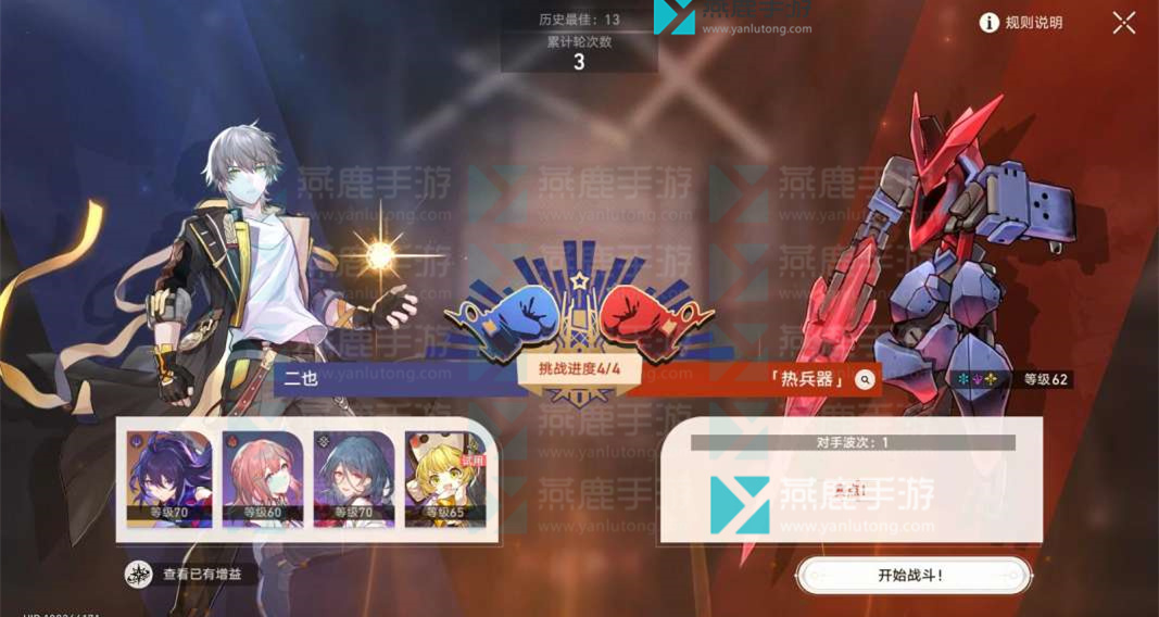 2、推荐配队。希儿、艾丝妲、娜塔莎、虎克。对手以火弱点为主,同时增益适合单体输出。看自己box进行替换。