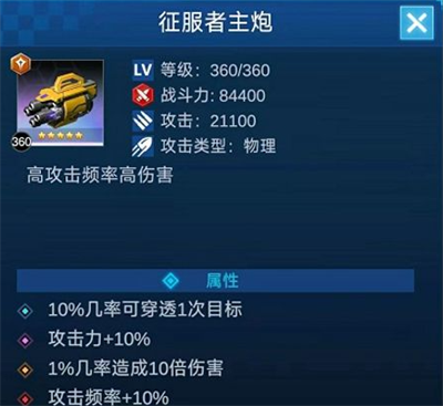 主炮推荐1:征服者主炮——作为征服者套装核心武器,具备极高基础伤害,适合快速推进关卡,是推图效率首选。