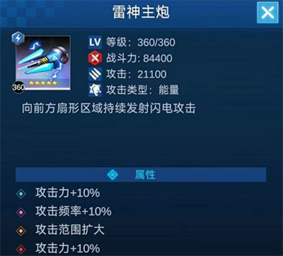 主炮推荐2:雷神主炮——向前方扇形区域持续释放闪电攻击,清小怪极为高效,视觉效果炫酷,适合应对群敌围攻。